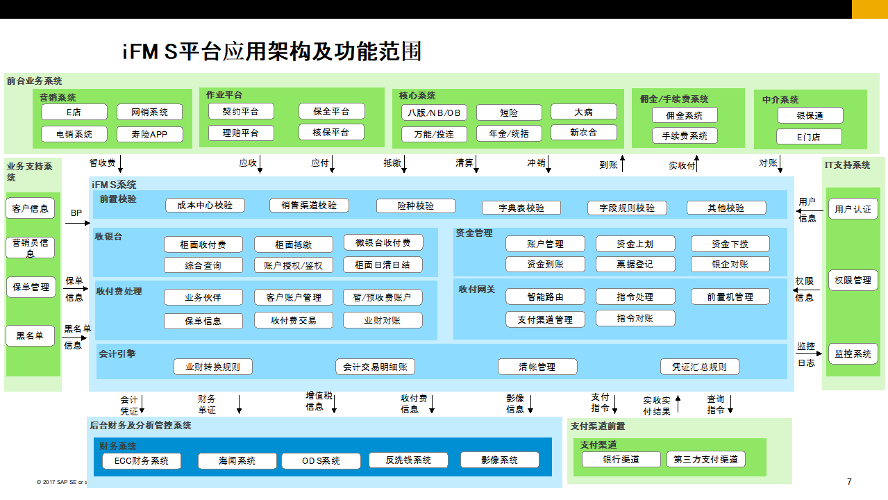 The capital settlement system is part of the core business of the new generation of insurance, which mainly provides account management capabilities and fund clearing capabilities (including fee collection, payment settlement, and internal fund settlement), as well as financial detail bookkeeping capabilities. As a management system that specifically operates the receipt and disbursement of funds, the front-end of the funds clearing system will receive information provided by sales, core and other business systems, and the back-end connects to the financial general ledgers, data warehouses and external fund clearing institutions such as banks and third-party payment institutions.