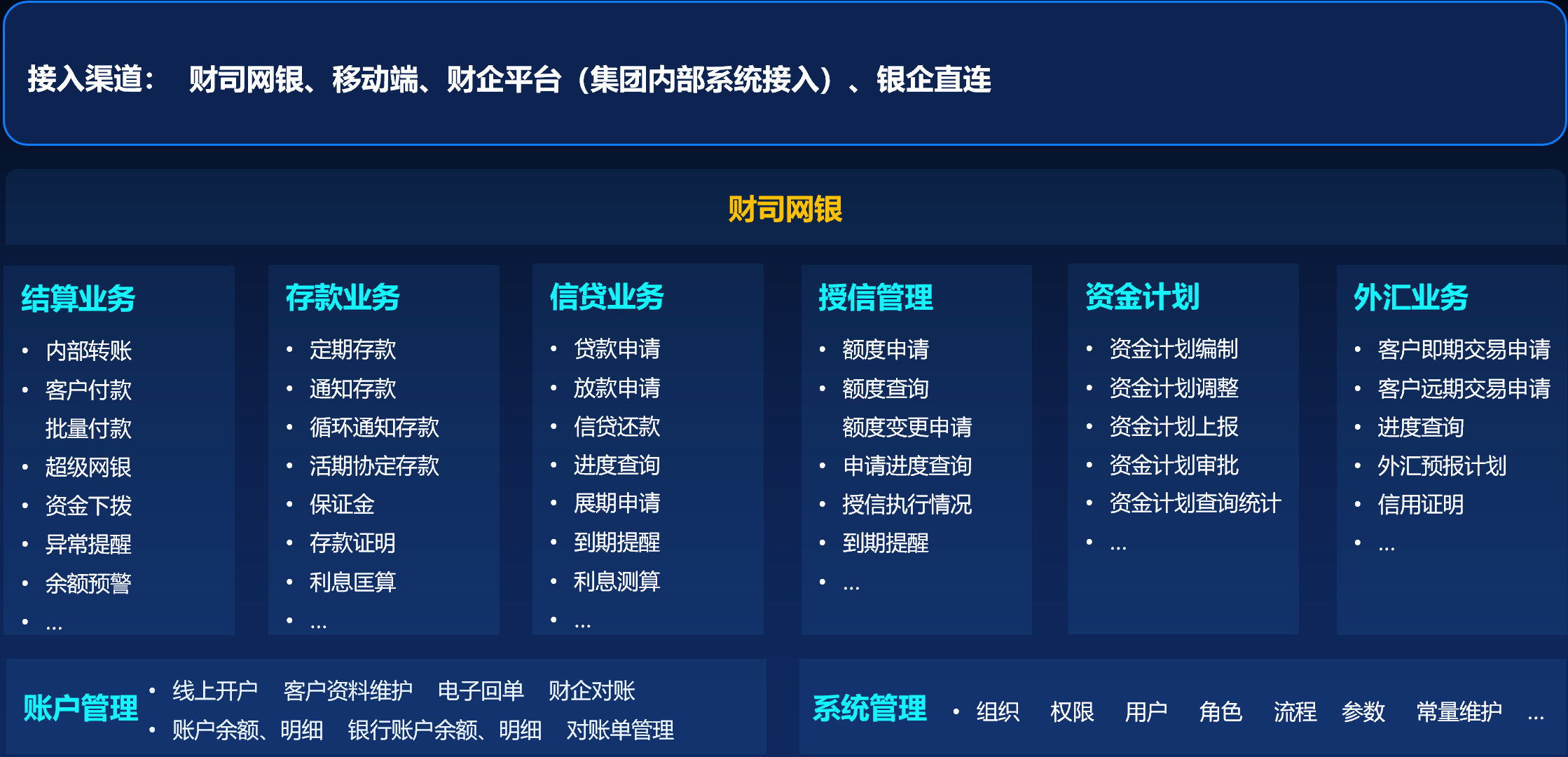 The platform fully covers the business needs of a finance company, including capital management, capital settlement, capital monitoring, credit, bills, interbank, foreign exchange, and financial services, and it integrates with the financial company's business systems to break down the information and process barriers of different business systems.