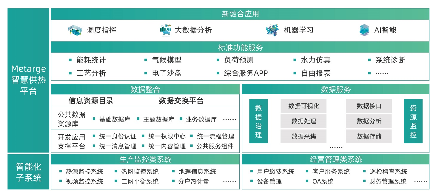 With the heating network monitoring as the starting point, the enterprise-level intelligent heating management and control platform consists of a production monitoring system and a Metarge platform. The platform integrates the production and operational systems of heating enterprises. Based on the fusion of information resources and guided by the design philosophy of integration and co-governance, it merges various specific applications to achieve data sharing and application collaboration.