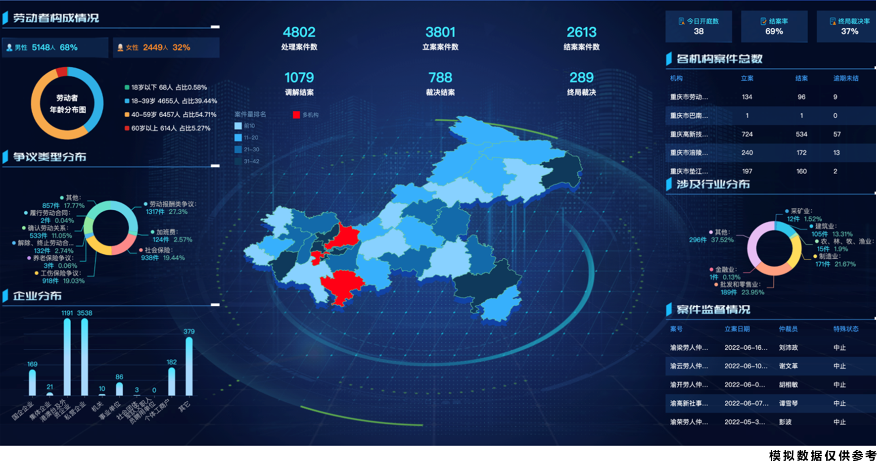 The Labor and Personnel Dispute Arbitration Service Solution focus on standardizing business data and bolstering data analysis and visualization capabilities. The platform leverages cutting-edge information technologies to conduct a thorough analysis of labor and personnel dispute-related activities, standards, and protocols. By monitoring the operational aspects of arbitration and mediation processes in real time, it precisely captures citizens' needs and challenges. This approach enables the platform to offer users scientific resource planning, strategic deployment, decision-making analysis, and personalized services. By providing accurate data-driven solutions, it continuously contributes to the advancement of the "digital human resources society".