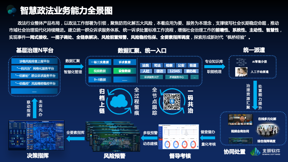 Beiming Software's advanced government and legal capabilities prioritize complaint services, data collaboration, and regulatory review, continually deepening its offerings. With a core focus on the multifaceted Online Dispute Resolution (ODR) platform, it caters to diverse public complaint service scenarios, emphasizing the primary responsibilities and core functions of government and legal affairs. By integrating government and legal data resources and placing social risk prevention and control at the forefront, the platform delivers various risk perception and index analysis applications. It drives innovation to achieve comprehensive grassroots legality reviews and digitally empowers modern social governance scenarios.
