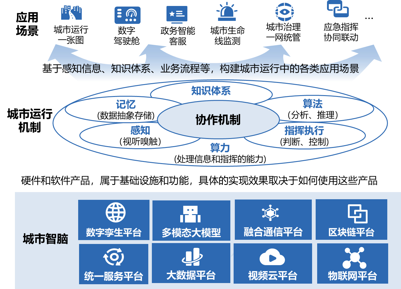 The Urban Intelligence Brain is the product of the integration of information technology and urban governance models. From a technical point of view, it is a city-level digital platform that combines big data, artificial intelligence, spatial-temporal information, the Internet of Things, video, and converged communication. It breaks the previous self-contained information construction model of various departments. Each system is no longer independently built as in the past, or peer-to-peer interacts with other systems. Instead, it shares data, calls on services, and interacts with the Urban Intelligence Brain to build the frontend of the "people-centered" business applications, form workflows for cross-department collaboration, and respond to changes in business needs. From a business perspective, the Urban Intelligence Brain is the "central system" of the city's integrated operation. It integrates technology with the business of various fields, provides "perception, data, cognition, and collaboration", forms a service capability that integrates perception, analysis, reasoning, decision-making, and action, and completes specific tasks in the business field in a highly coordinated manner, enabling business innovation in various departments.