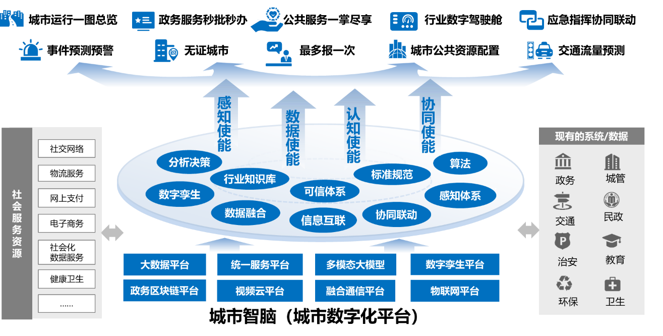 By integrating the city's existing information systems and data resources, the Urban Intelligence Brain integrates cloud computing, big data, artificial intelligence, digital twins, converged communications, and the Internet of Things to build a converged and interpenetrating city-level digital platform. It is also combined with the transformation of the city's operating system, through the integration of technology and industry business, and forms a hub for gathering data, refining knowledge, coordinating command, and supporting city-level information sharing, business collaboration, and integration and innovation. The Urban Intelligence Brain is like the human brain, learning about the operation of the world by integrating information from various senses in the body. By accumulating experience in various aspects, it forms a cognition of affairs, combines information in all aspects, makes analysis and judgment in advance, and commands various parts of the limb to make a coordinated response.