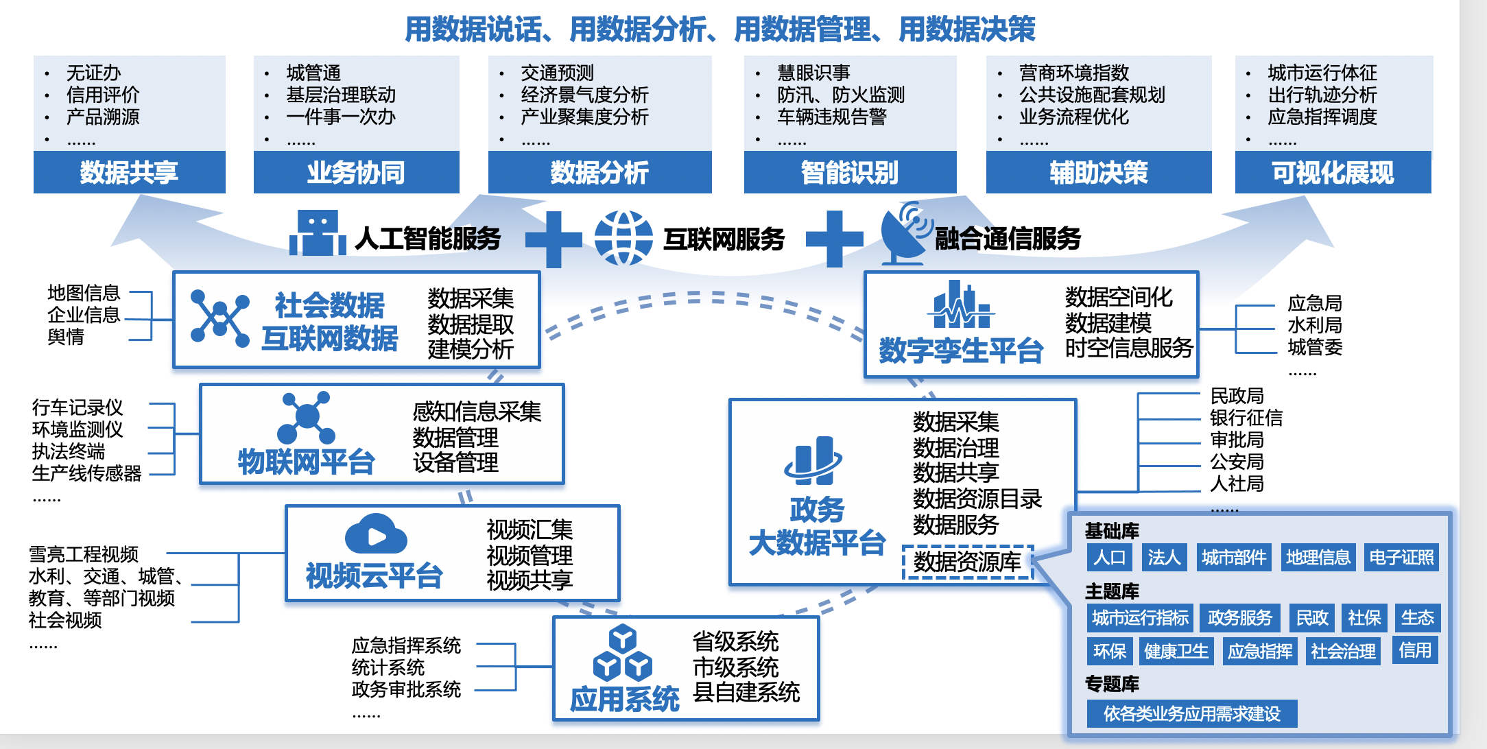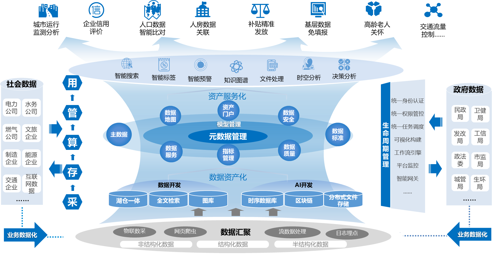 The City Big Data Platform is a comprehensive technology platform that realizes urban data assetization and asset servicification, and has the ability to cover the full life cycle management and services of data "collection, storage, calculation, management, and use". Through the Digital Intelligence Fusion Technology, the unstructured, real-time, offline and IoT-aware heterogeneous data from various government departments and public utilities, enterprises and other sources are rapidly fused to establish a high-quality data system for different industry sectors. At the same time, with the goal of business scenarios, combined with intelligent search, smart labels, knowledge graphs, and other technologies, the system can fully tap the value of data elements, effectively promote data sharing, development, and utilization across departments, and build a series of innovative application scenarios such as public data disclosure, intelligent comparison of people-accommodation data, urban operation monitoring and early warning, credit evaluation, supply chain collaborative manufacturing, etc., to form a business management model of "speaking with data, analyzing with data, managing with data, and making decisions with data".
