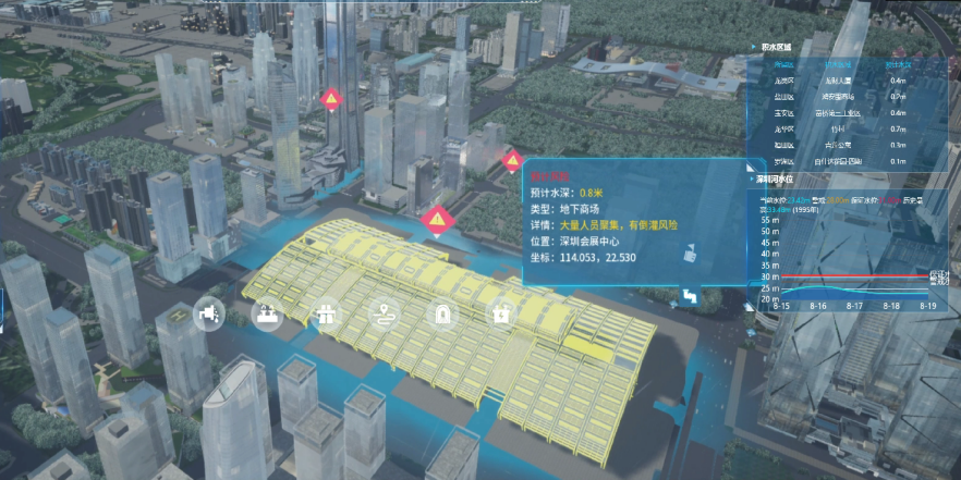 The platform combines rainfall data, surface runoff data, pipe network convergence data and other data from past rainstorms to build an urban flooding simulation and deduction model, which can be used daily to simulate and deduce the flooding of the city's existing pipeline network, optimize the facilities of the regional drainage network, and improve the emergency prevention and control capabilities. When a torrential rain event occurs, the platform assists in calculating the evolution of waterlogging at regional flooding points, and predicts those areas that may be submerged.