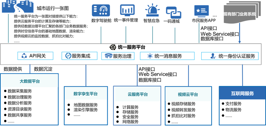 To integrate various urban information resources and multiple internet services into a unified city operations map, the unified service platform connects with cloud service platforms for computing and storage capabilities, integrates business data from various departments aggregated by the city’s big data platform, interfaces with the digital twin platform for base map data and rendering capabilities, and links with video cloud platforms for monitoring data and intelligent recognition capabilities. This setup restores the real-time status of city operations and enables integrated analysis, visualization, and dynamic interaction of urban data.