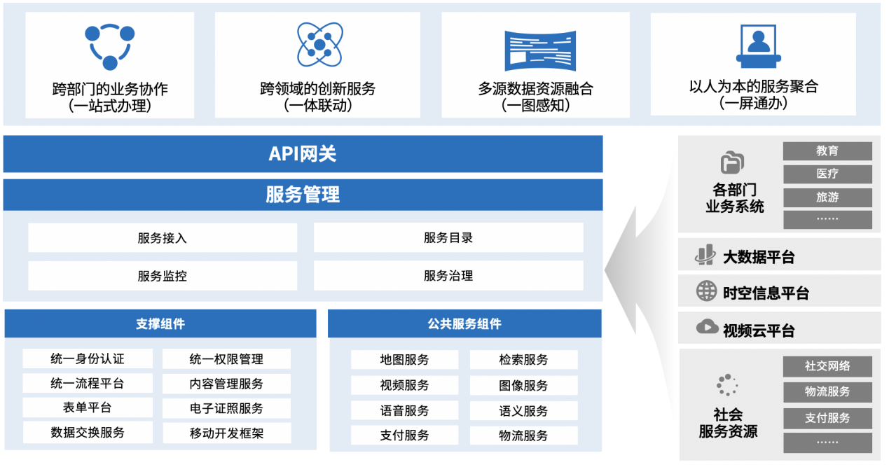The platform integrates information resources from government departments, social institutions, individuals, and other channels to achieve information sharing and business synergy between cross-domain heterogeneous systems.