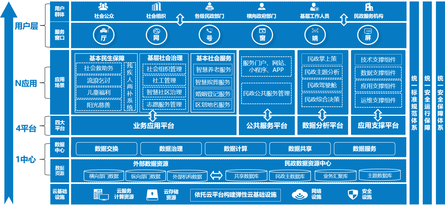 With enhancing the intensive construction of civil affairs information, standardizing management, and facilitating services as the principle, we aim to make full use of the existing civil affairs information system, create a unified civil affairs network, and connect the five levels of provinces, cities, counties, towns (subdistricts), and villages (communities) to form a vertical departmental data channel, build a social governance hub, and create a position to protect people's livelihoods.