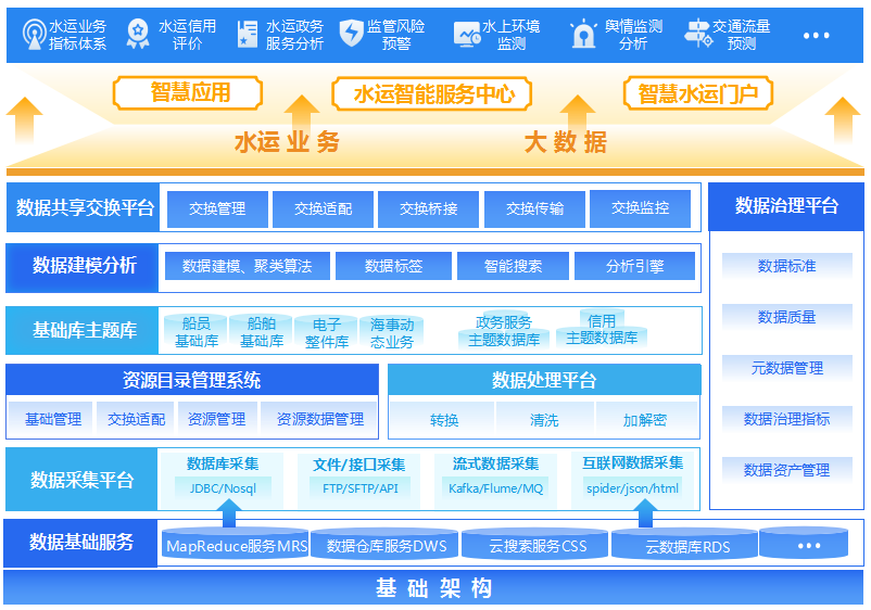 The data center solution for water transportation consolidates water transportation business data, location data, third-party data, and Internet data. By processing these through collection, conversion, analysis, and delivery, it creates a comprehensive data center. The data center offers five out-of-the-box capability tools, providing a one-stop toolkit for water transportation informationization. This effectively lowers the barriers to big data development and reduces the workload for code and system maintenance.
