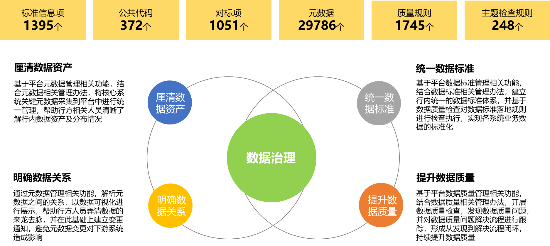 The project aggregated the front-, middle- and back-end data, incorporated 29,786 metadata items from 17 business systems under management, sorted out 1,395 standard information items, 372 public codes, and configured 1,745 quality rules, providing accurate, reliable, and consistent data for comprehensive risk management and control, business innovation, and decision-making reports.
