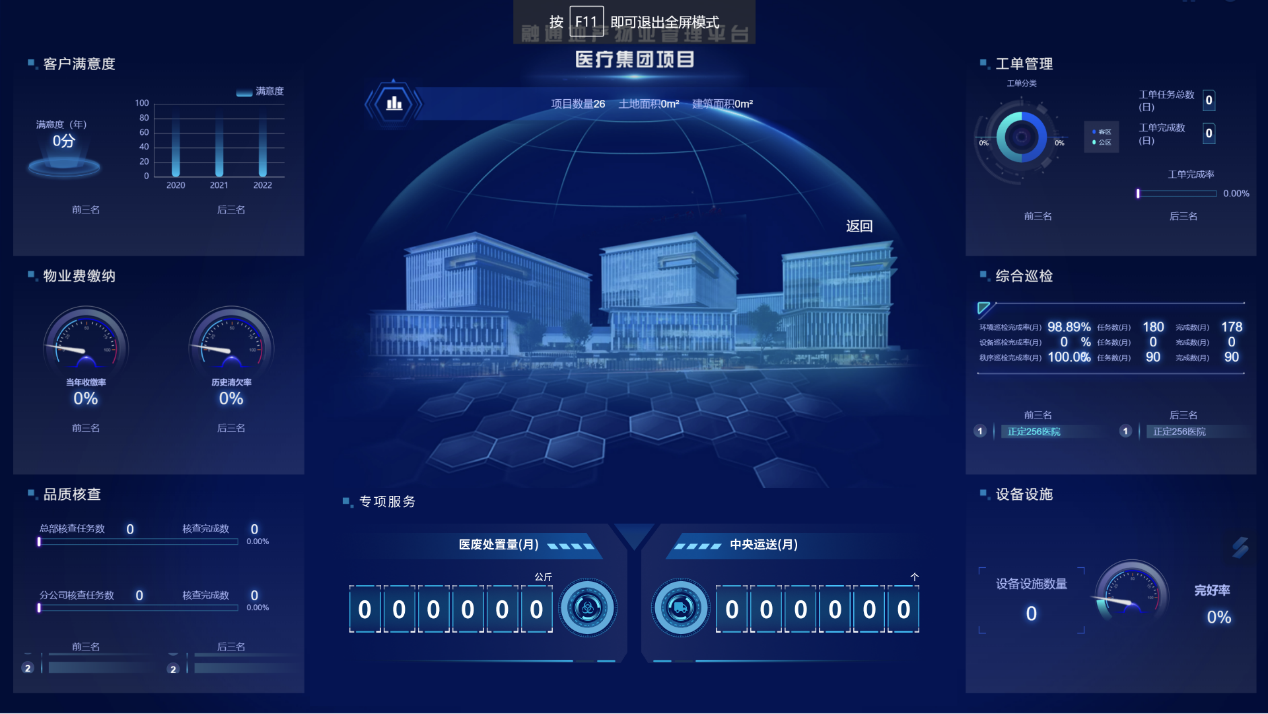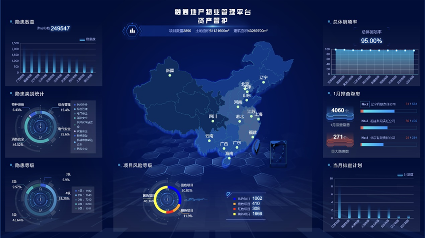 The integrated management platform features a large IOC visualization screen tailored to meet users' specific needs, offering a comprehensive data visualization solution. Through data visualization technology, the platform presents data in charts and other forms, making data easier to understand and use. At the same time, the platform sets different levels of viewing permissions for users with different needs, allowing centralized presentation and analysis of the company's current business status across various levels — from the headquarters, regions, branches, and projects to different business areas such as work order management, inspection management, hidden hazard investigation, and parking management.