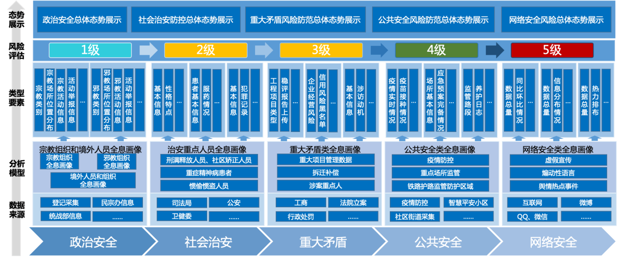 The social risk assessment and analysis platform mainly focuses on comprehensive assessment and analysis, intelligent command and dispatch, and all-factor supervision and evaluation. It integrates the grassroots grid risk investigation mechanism, establishes databases for key personnel, events, and organizations in the region, deepens multi-sector data integration and analysis, and employs multiple algorithms to assist risk assessment and decision-making. It achieves early detection and prevention of regional key areas and major risks, diversified resolution of conflicts, multi-party coordination, and continuous follow-up of subject responsibilities.