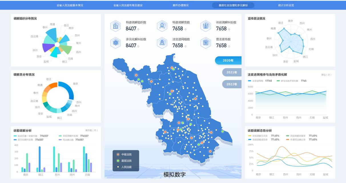 As a general data portal, the judicial big data intelligent analysis system supports unstructured data queries such as administrative and judgment documents. It can meet the needs of rapid queries of quality and effectiveness indicators and visualize work-level displays, and automatically generate situation analysis reports and calculate case standards. The system meets the information query needs for case handling by judges, data queries for leaders' office use, supervision and management of trial quality and efficiency, and supports multiple functions such as a large-screen display of data in cockpit mode. In addition, the system can help users discover hot spots and key issues in economic development and social governance related to court work, effectively explore the intrinsic relationship and potential value of data, assist users in producing situation analysis reports and thematic analysis reports, and provide auxiliary decision-making references for judicial management and social governance.