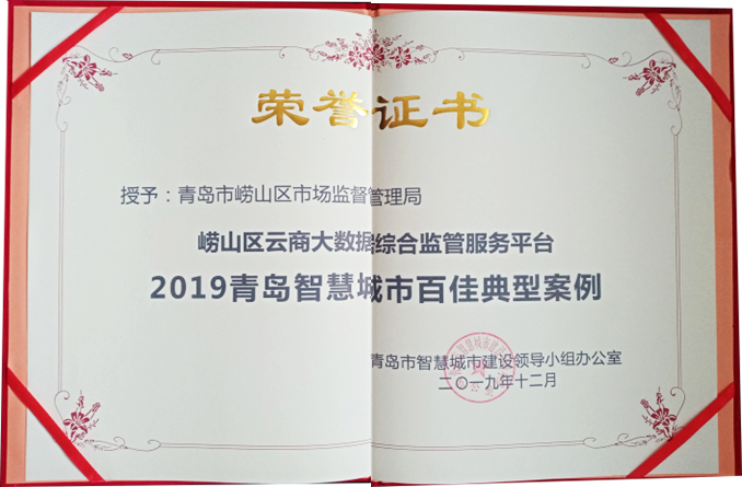In 2019, the "Laoshan District Cloud Business Big Data Comprehensive Regulation Service Platform" led by the Laoshan District Market Supervision Bureau was awarded the 2019 Qingdao Smart City Top 100 Exemplary Cases, and was promoted by many newspapers such as the China Market Regulation News and the China Quality Newspaper.