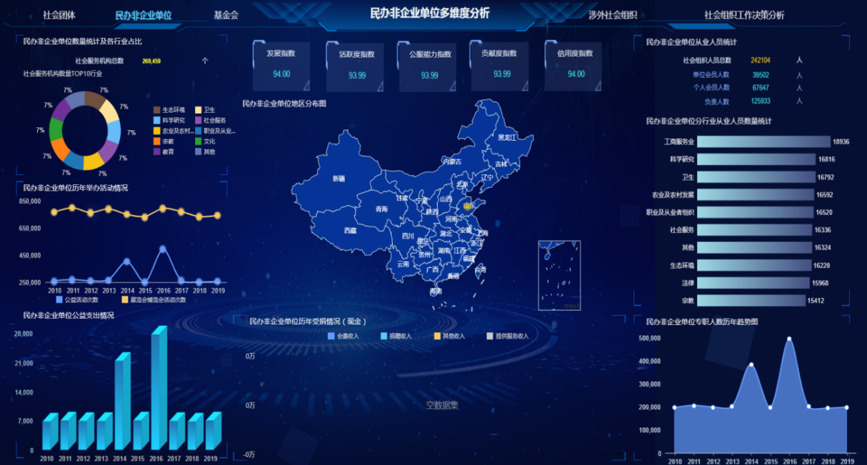 - 2. By using various types of visual tools such as maps, ranked lists, and heat maps, which are combined with independent variables of models, the platform presents a multi-angle view of the development indexes of social organizations to provide basis and services for leadership decision-making, policy formulation, supervision and evaluation, and continuous optimization at all levels.
