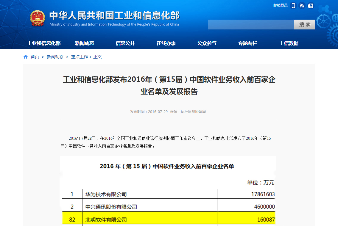 2016年7月28日,在2016年全国工业和通信业运行监测协调工作座谈会上,工业和信息化部发布了2016年(第15届)中国软件业务收入前百家企业名单及发展报告。北明软件有限公司再度榜上有名,连续第四年成功入围中国软件业务收
