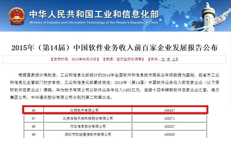 近日,工业和信息化部发布了2015年(第14届)中国软件业务收入前百家企业名单,北明软件有限公司连续三年榜上有名,名次较去年再次提升,名列第66位。 据了解,中国软件业务收入前百家企业是工信部重点调度企业,本届前百