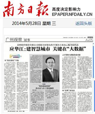 5月28日,《南方日报》专版刊登对北明软件股份有限公司(以下简称“北明软件”)总裁应华江先生的专访文章——《应华江:建智慧城市 关键在“大数据”》。文中,应华江总裁回顾了北明软件的发展历程,并就公司未来发展布局