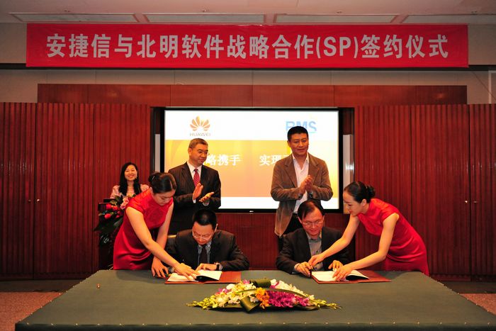 2013年1月11日,北明软件股份有限公司在深圳华为总部高培中心与华为安捷信网络技术公司签署战略合作协议。 该协议由北明软件总裁应华江、华为安捷信总裁马悦共同签署;北明软件董事长李锋、华为全球企业业务B