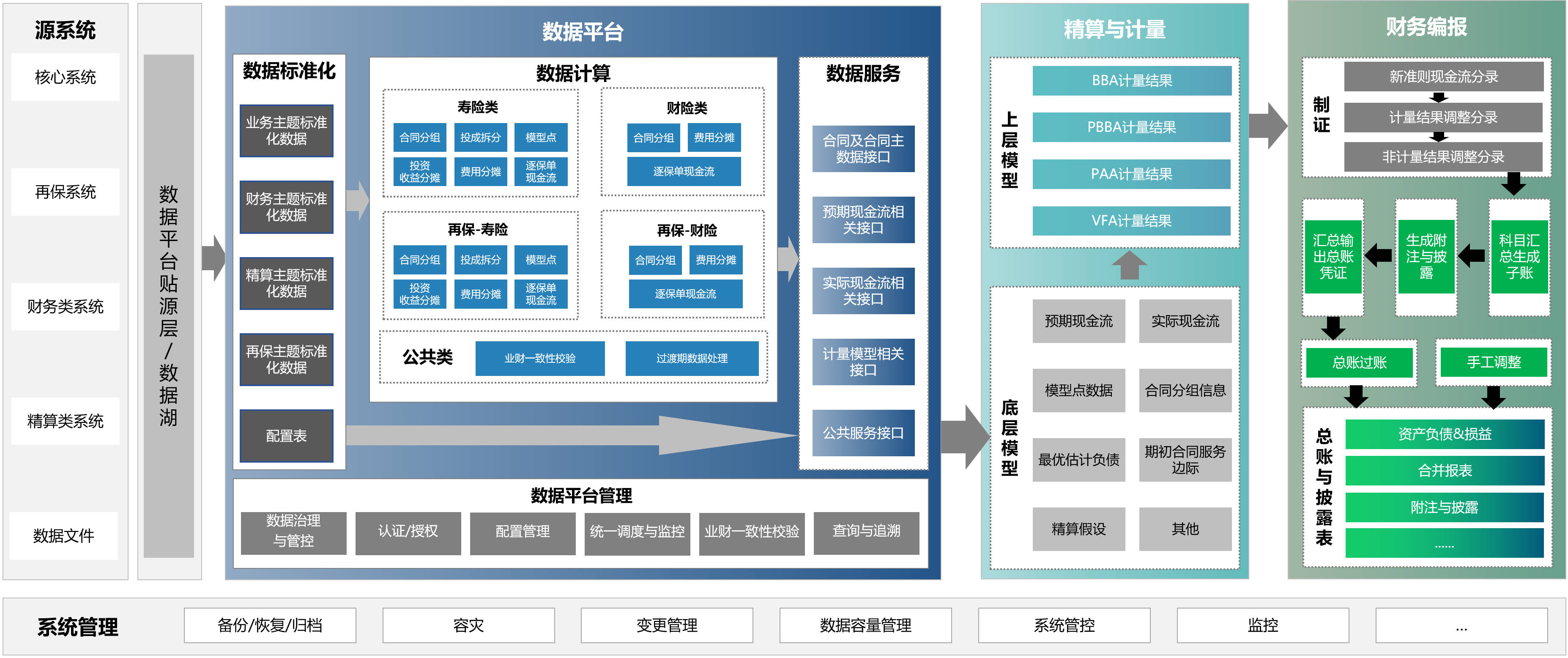 数据平台承载基础数据汇聚及准备工作,为计量和子账系统等实施提供数据支持;计量平台接收数据平台和精算系统提供的模型输入数据,按不同业务类型和计量方法执行核心计量,同时支持灵活试算,允许在不同业务粒度执行核心计量;会计引擎接收数据平台提供的实际现金流,与计量平台输出的预期现金流数据汇聚后,按照新准则要求创建核算分录体系,完成业财转换,形成子账并映射汇总为总账