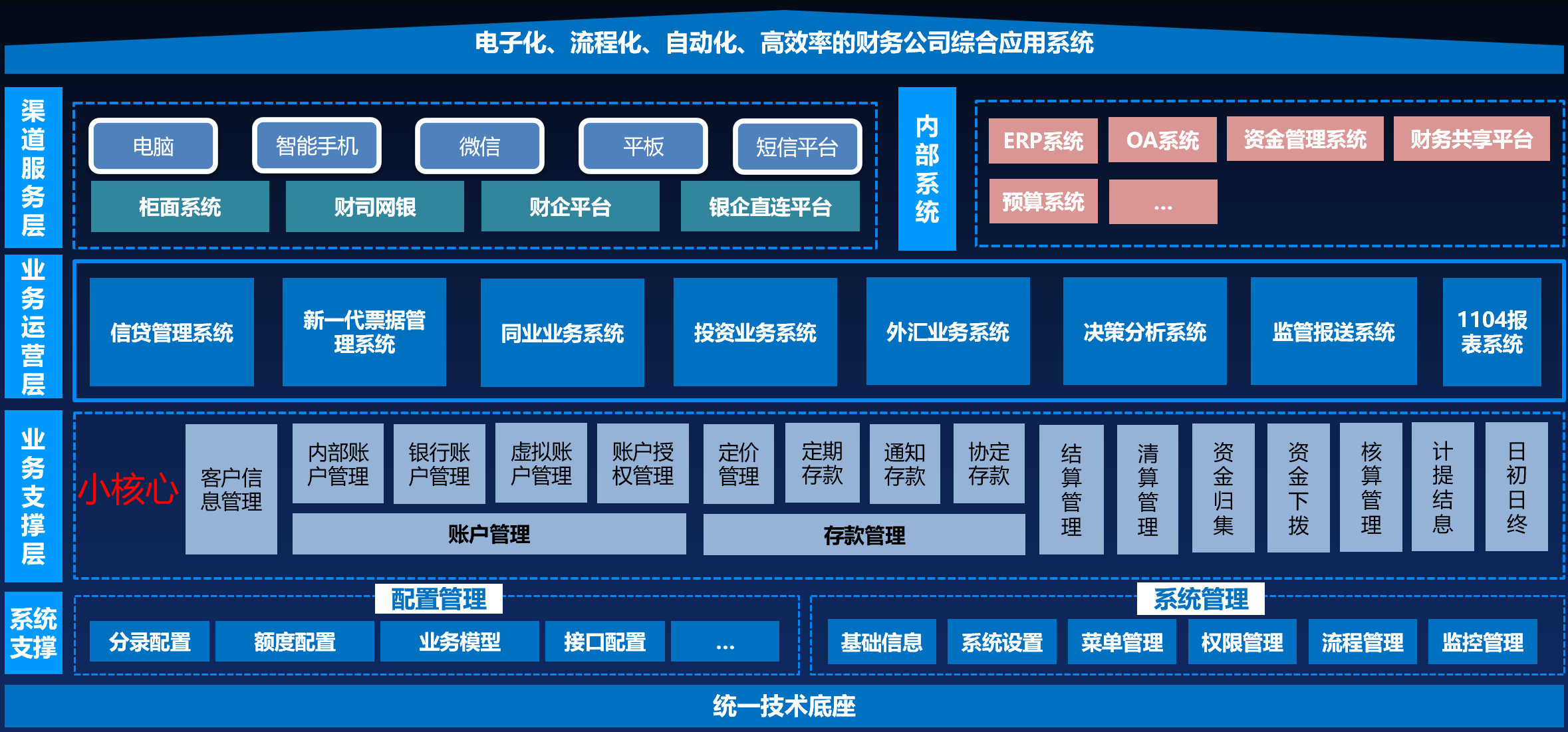 全面覆盖财务公司资金管理、资金结算、资金监控、信贷、票据、同业、外汇和金融服务的业务需求,对财司业务系统进行整合,打破不同业务系统的信息和流程壁垒。