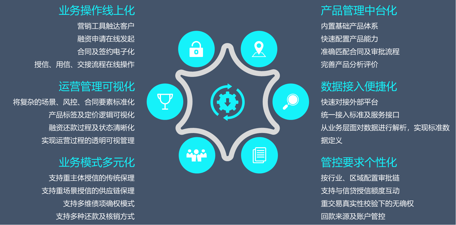 系统可支持供应链保理业务的全线上操作,功能包括:线上企业注册开户、用户登录、基础资产的维护和确认、融资业务的发起和审批、业务状态查询及贷后各项业务处理。同时,系统中的各类流程、业务管控条件、风险识别条件、授信评价模型、核算规则等应支持参数化配置,可由系统管理人员通过系统功能灵活进行参数配置和调整,提供最大程度的业务灵活性和便利性。
