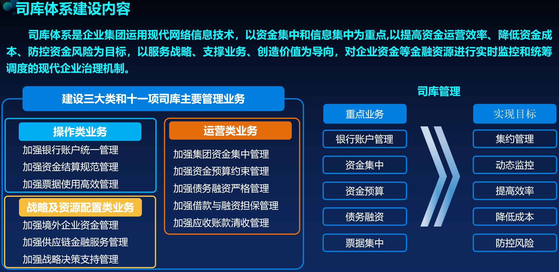 司库管理信息系统依托集团财务公司、资金中心为集团公司提供"资金运营+资金统筹+风险管控+智能化决策"整体解决方案,实现集团资金统一运营、金融资源统筹管理、资金风险全面管控。司库管理信息系统建设涵盖银行账户统一管理、内部账户管理、资金集中管理、资金结算管理、资金计划管理、债务融资管理、担保管理、内部借款管理、票据管理、应收账款管理、资金监控与预警管理、资金决策支持与信息管理。通过司库管理信息系统建设,统一资金结算出入口,强化资金风险监管,提高资金运营效率、降低资金成本,以服务集团战略、支持主业发展、创造价值为目标,对集团内部金融资源进行实时监控和统筹调度,形成合力,打造综合性金融服务体系。