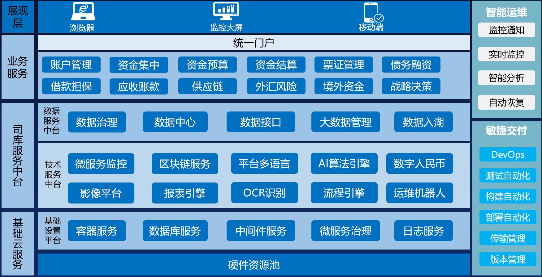司库管理平台各业务模块和系统之间互联互通,有机结合,为客户提供资金等金融资源实时监控和统筹调度的一站式整体解决方案。