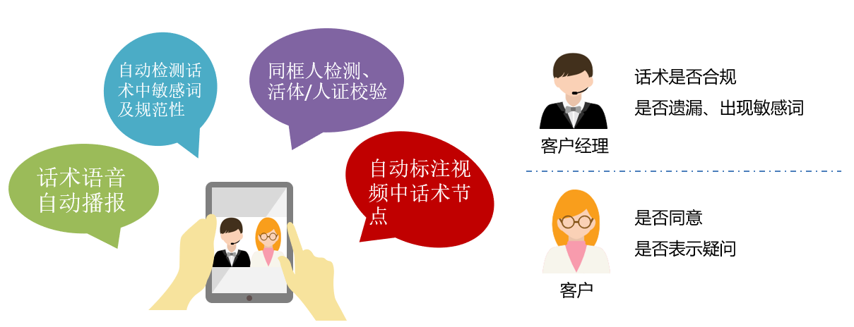 OCR识别技术通过扫描仪、手机摄像头等图像输入设备,可以快速采集目标物体上的文字信息。该技术不依赖于网络,支持PC端、服务器端(Windows、Linux)与移动端(IOS、Android)各种系统平台使用,方便快捷。3、智能双录 保证关键环节可追溯