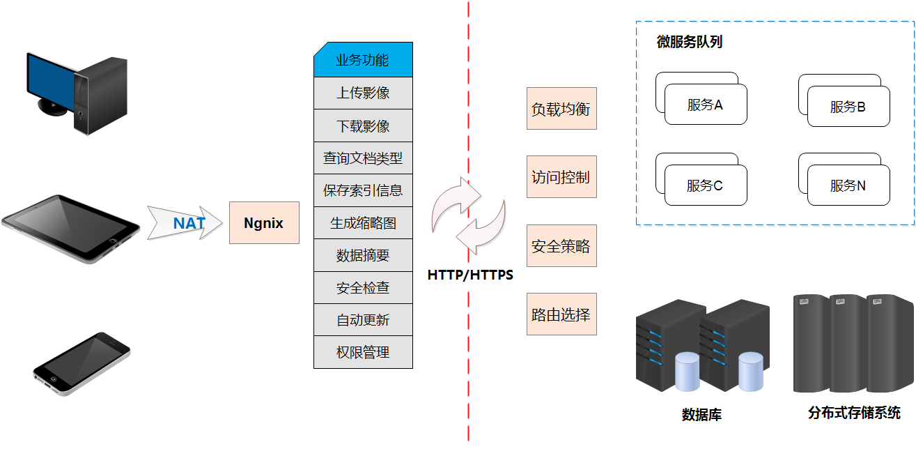在智能化影像平台应用架构部署上,根据业务功能,将前、后台服务进行分离,更灵活的进行业务组合。