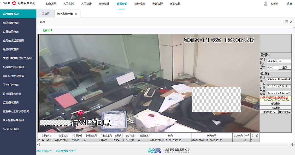 系统提供业务场景视频或安防视频对接,可对业务类、非业务类、服务类进行监督,在视频监督时,可同时查看核心流水以及会计分录信息。