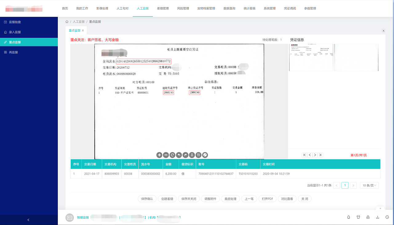 系统根据业务种类、凭证种类预先设置好每种业务所需核对的要素,通过OCR识别凭证要素后与核心系统中对应的流水信息进行勾对,对系统无法自动勾对的凭证,由人工根据凭证影像补录流水号、账号、金额等要素后重新建立凭证的电子信息,再由系统自动勾对。