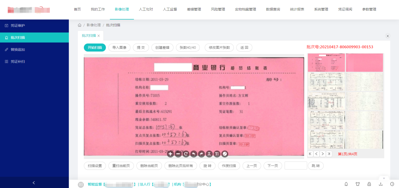 通过高速扫描仪对业务凭证进行双面扫描,系统将纸质凭证转化为电子影像,对扫描后的影像自动进行图片增强、去底纹、黑边、斑点、纠偏等图像处理,确保采集到最佳的凭证影像效果,完成电子档案建立。此外,系统还会对扫描后的影像进行质量检查,将影像不符合要求的凭证标记后重新扫描。2、票据板式及OCR识别