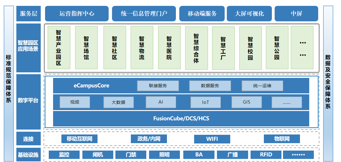 智慧园区解决方案采用统一的综合管理平台,集成园区的各个系统模块,实现一站式的服务和统一的运维管理。智慧园区解决方案总体架构分为五层:服务层、应用层、平台层、连接层、感知层。