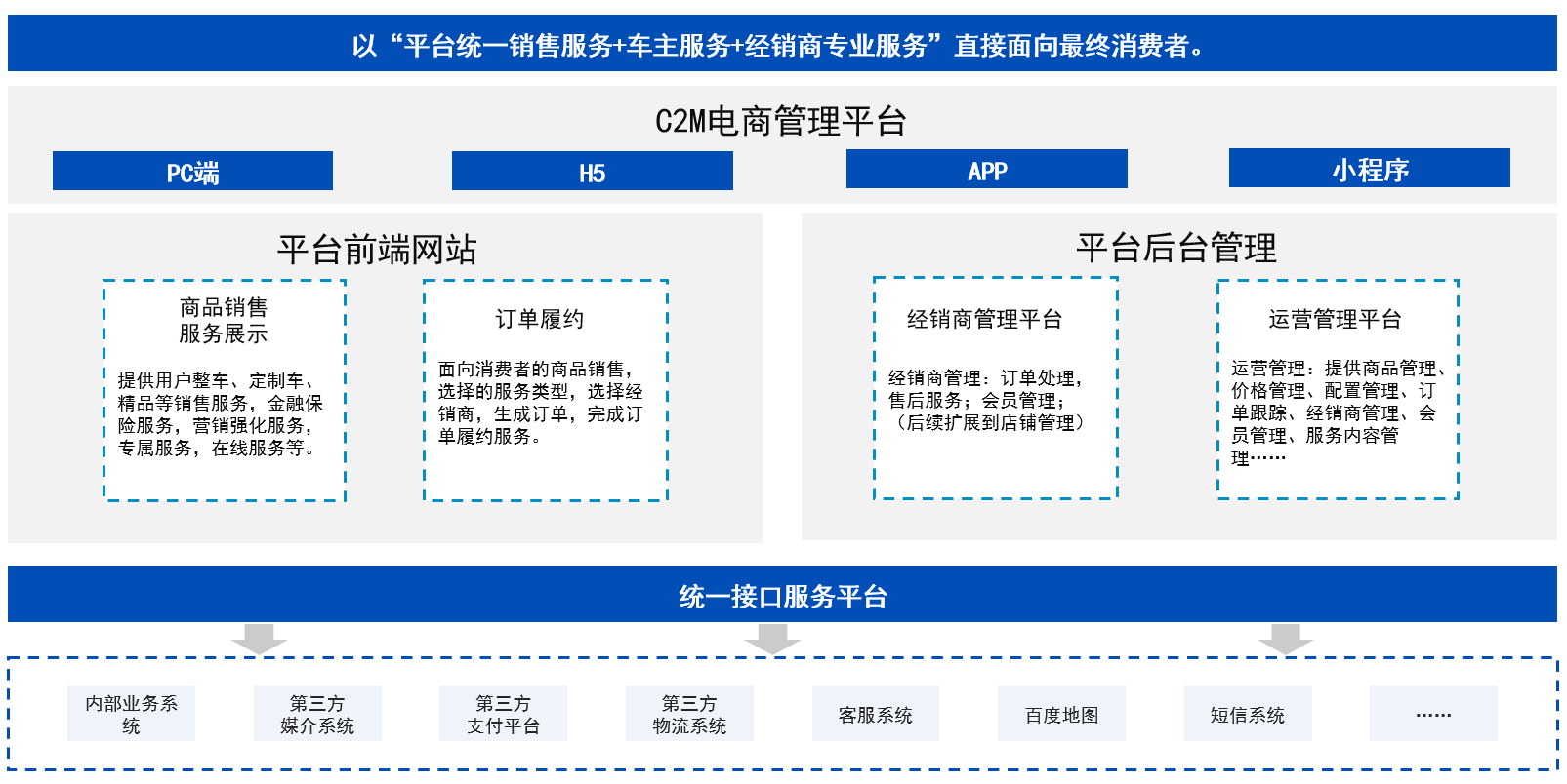 方案以C2M电商为核心,整合销售、制造、BOM、营销、会员等各系统,订单状态、重要环节车辆生产状态全程可视,各系统协同运作,提升效率。