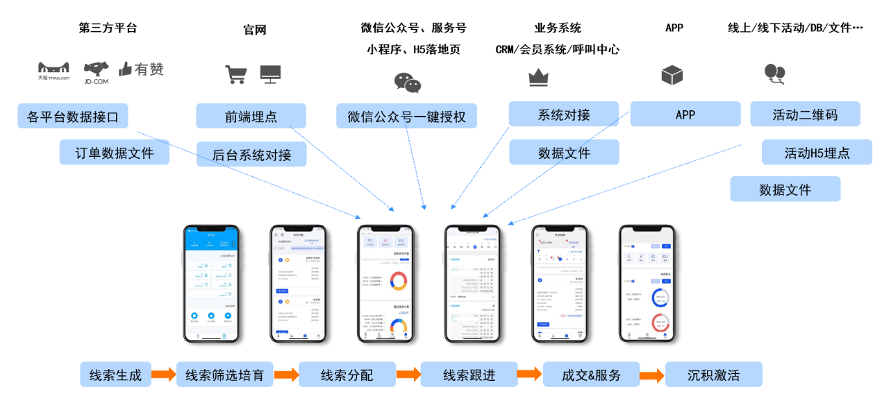 汽车行业数字化营销解决方案的线索管理系统汇集从短视频和直播等新媒体平台(抖音、快手等)、第三方平台、官网、公众号、服务号、小程序、H5落地页、各业务系统、APP、线上线下活动等各触点矩阵的线索,管理线索全周期流程,包含线索生成、线索筛选培育、线索分配、线索跟进、成交&服务、沉淀激活等。