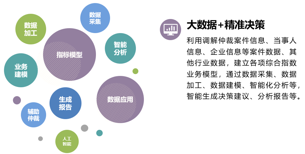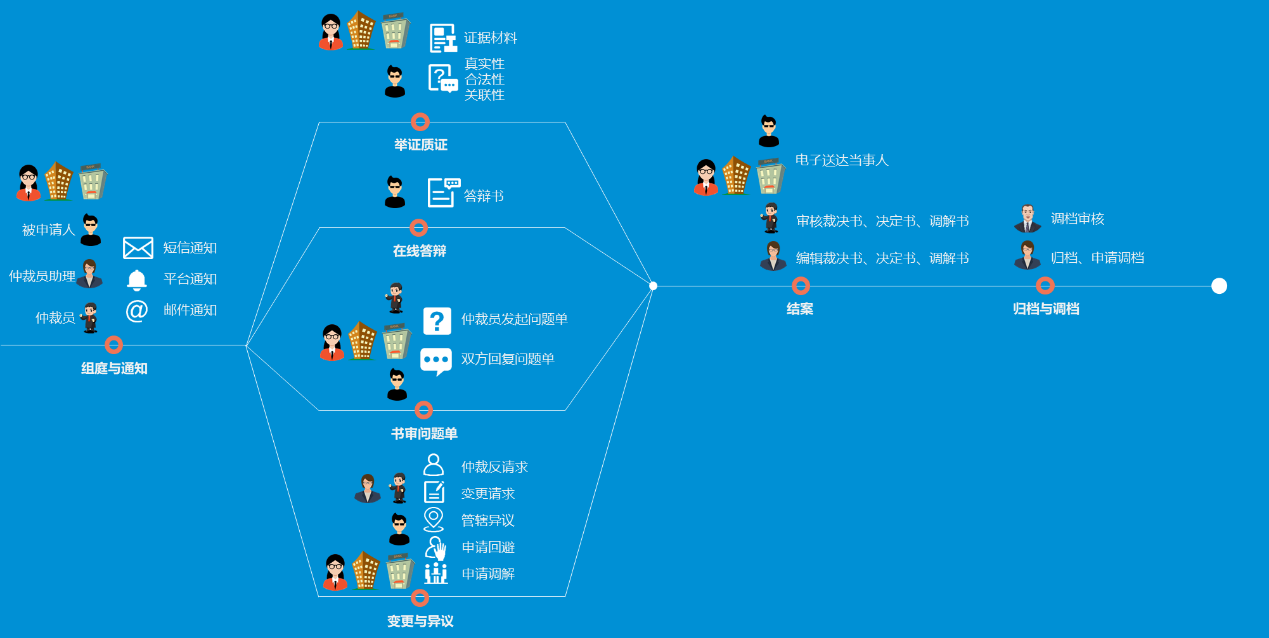 商事仲裁服务解决方案将先进技术与仲裁调解业务深度结合,整合仲裁机构、调解机构、企业及相关单位仲裁资源,实现在线申请调解/仲裁、在线分案、在线开庭、在线办结、调解协议仲裁审查等业务全流程在线审批和办理,提高仲裁质效。