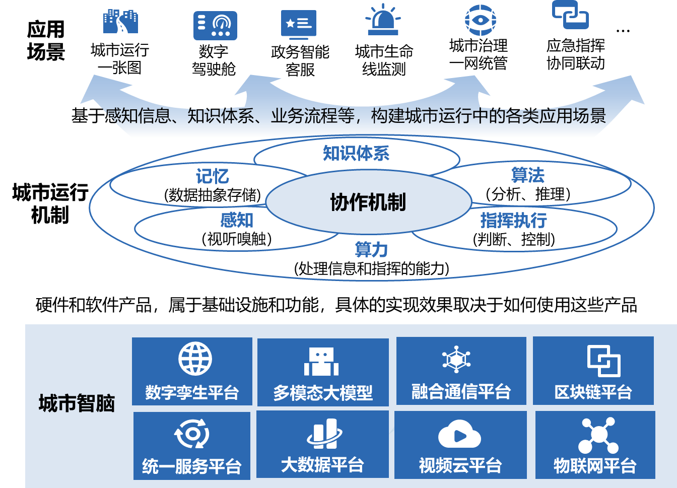 城市智脑通过整合城市现有的信息系统和数据资源,将云计算、大数据、人工智能、数字孪生、融合通信、物联网等技术集成在一起,构建一个汇聚融合、相互渗透的城市级数字化平台;并结合城市运行体系的变革,通过技术与行业业务的融合,形成汇集数据、提炼知识和协调指挥的中枢,支撑城市级的信息共享、业务协作和融合创新。城市智脑就如同人的大脑,通过整合来自身体各个感官的信息,获知世界的运行情况;凭借积累各方面的经验,形成对事务的认知;组合各方面的信息,提前做出分析判断,指挥肢体各个部分做出协调反应。
