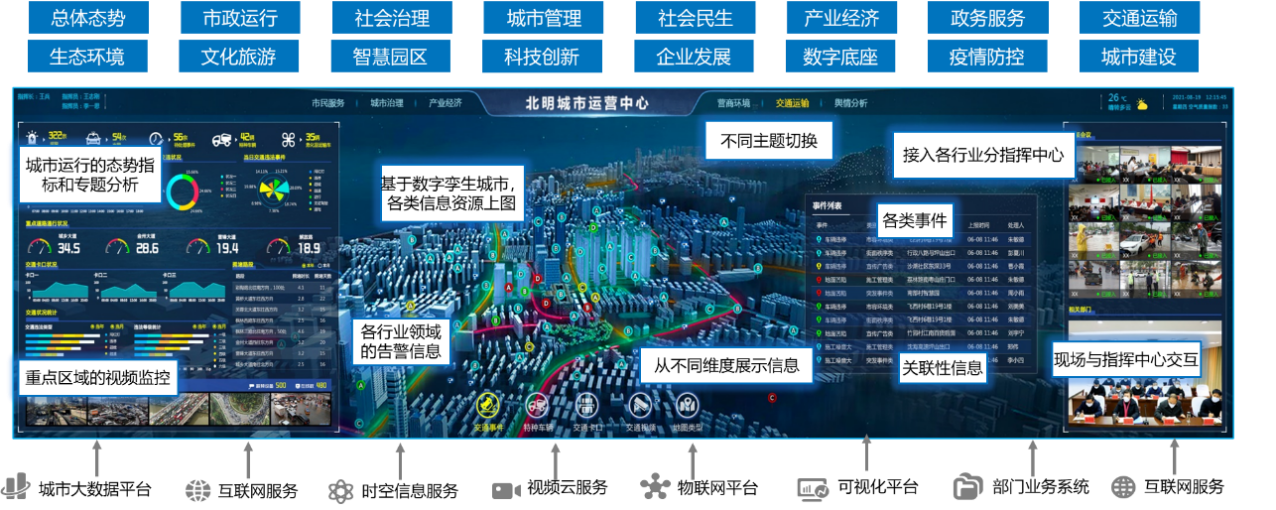 城市智脑将云计算、大数据、人工智能、数字孪生、融合通信、物联网等技术集成在一起,通过整合城市现有的信息系统和数据资源,形成一个汇聚融合、相互渗透的城市级数字化平台,进一步消除了纵向的行业壁垒,让城市的生产、生活、治理、服务更有机地成为一个整体,更好地支撑城市运行“一图总览”、政务“秒批秒办”、公共服务“一掌尽享”、城市治理“一网统管”、应急指挥“一体联动”等活动,推动各行业数字化转型升级,构建以“集约建设、纵横联通、业务协同、智能应用”为特征的新型智慧城市运行体系。
