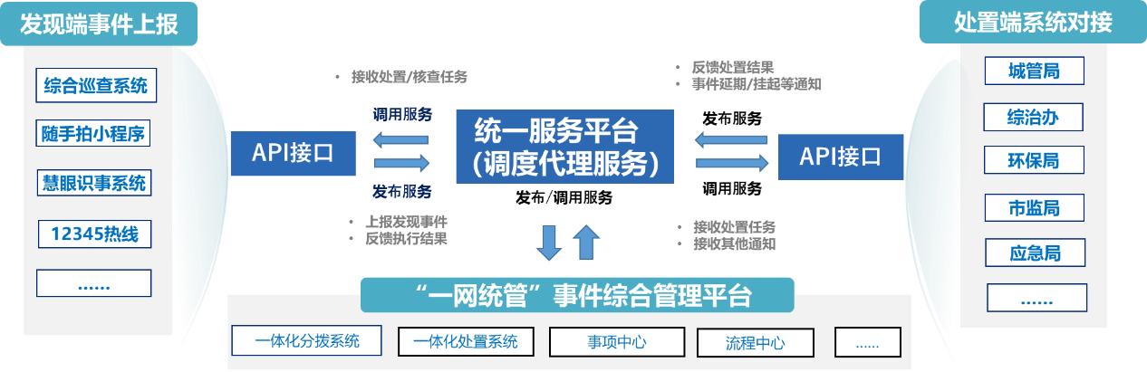 “一网统管”平台整合了各个部门的事件,需对接12345热线、城市服务APP、视频云服务以及各政府部门的业务系统等。由于系统接口多、标准不一,不利于“一网统管”平台的管理和维护。统一服务平台为“一网统管”提供事件调度代理服务,统一对接、管理各类系统及数据资源,灵活调度事件信息,加快跨部门的信息协同,推动“一网统管”业务高效运行。