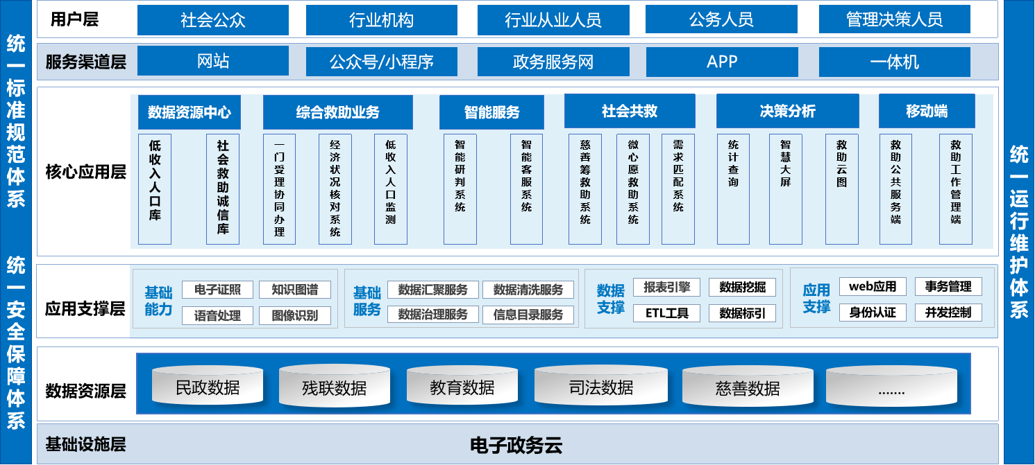 - 智慧服务:建设具备掌上办理、智能研判、智能客服、救助资源匹配等功能的社会救助智能服务系统,实现各类社会救助资源和救助资金按需分配、有序流动、精准使用,及对各类救助问题的智能问答。