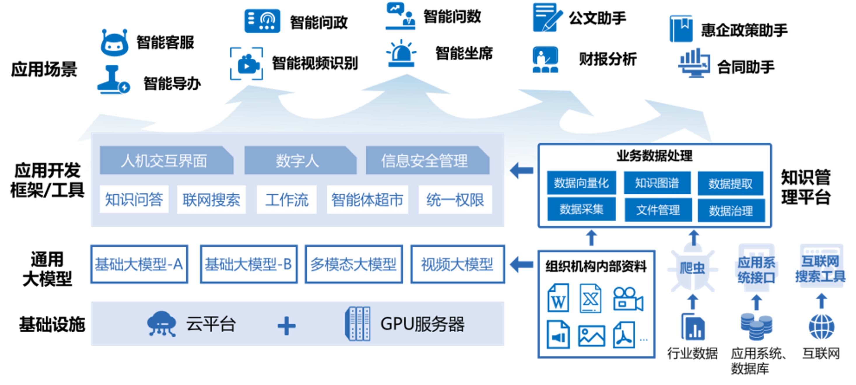 针对政府部门信息安全需求,大模型政务领域解决方案采用私有化部署的方式,综合应用多模态数据处理、RAG(检索增强生成)、KAG(知识增强)、AI Agent等技术,将大模型与政务领域的数据充分融合,构建政务管理及服务的创新应用场景。 方案技术架构总体分为算力基础设施、知识管理、应用开发和创新应用场景四个部分。底层是算力基础设施,可以采用私有化部署的服务器,也可租用云平台的智算资源,并灵活部署多种大模型产品。在此基础上,知识管理层对来自政府内部、社交媒体、互联网、公共数据库及业务系统等多源异构的行业数据进行统一汇聚、加工与处理,为大模型检索行业知识提供丰富的数据来源;应用开发层则提供智能体构建的统一技术框架,内置丰富的开发工具和应用组件,针对不同的业务需求,以可视化界面和拖拉拽的操作方式灵活构建各类智能体,并配合“边开发边调试”的敏捷开发模式,大大降低了智能体的技术开发门槛;应用层面针对政务领域的业务需求,可以构建“智能客服、智能问政、智能问数、公文助手、政策助手、事件智能识别、智能坐席、合同助手”等一系列创新应用场景,为用户带来更智能、高效、个性化的大模型服务。