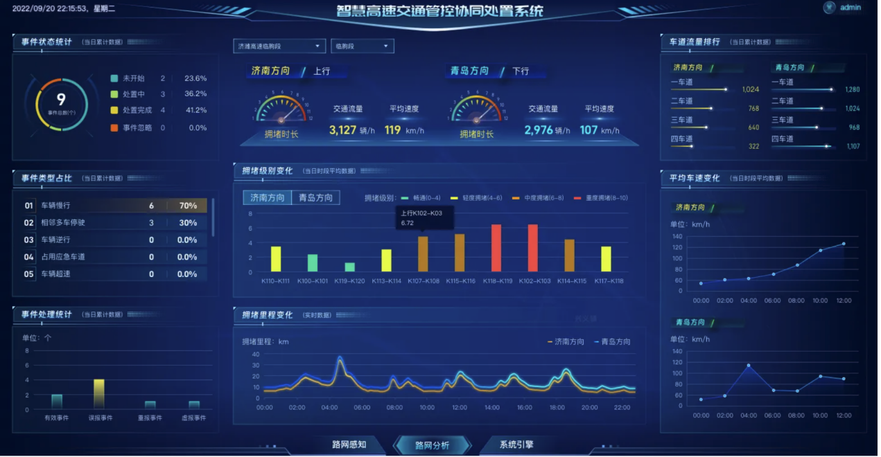 监测高速路网通行状态、路面事件、指标变化趋势。传统路网管理主要依靠人工巡查,少量道路拥堵、交通事故、路面异物等不能被第一时间发现,为路网管理带来困难。路网监测基于前端感知设备确保第一时间发现事故、拥堵、违停等路况事件,克服人工监测和车辆巡查的短板,提高安全处置效率。