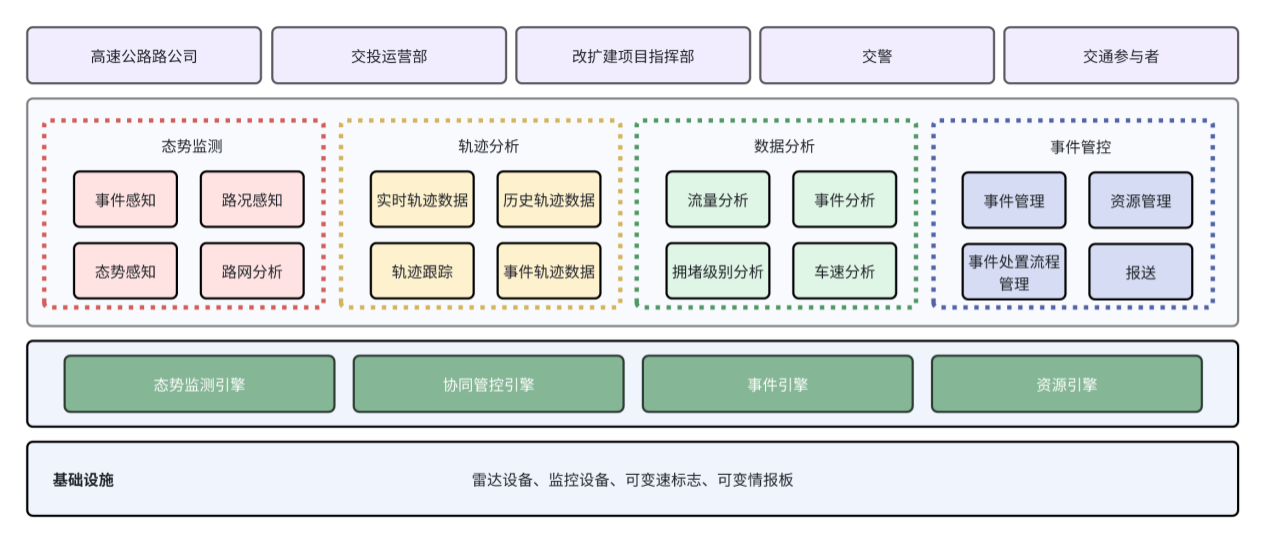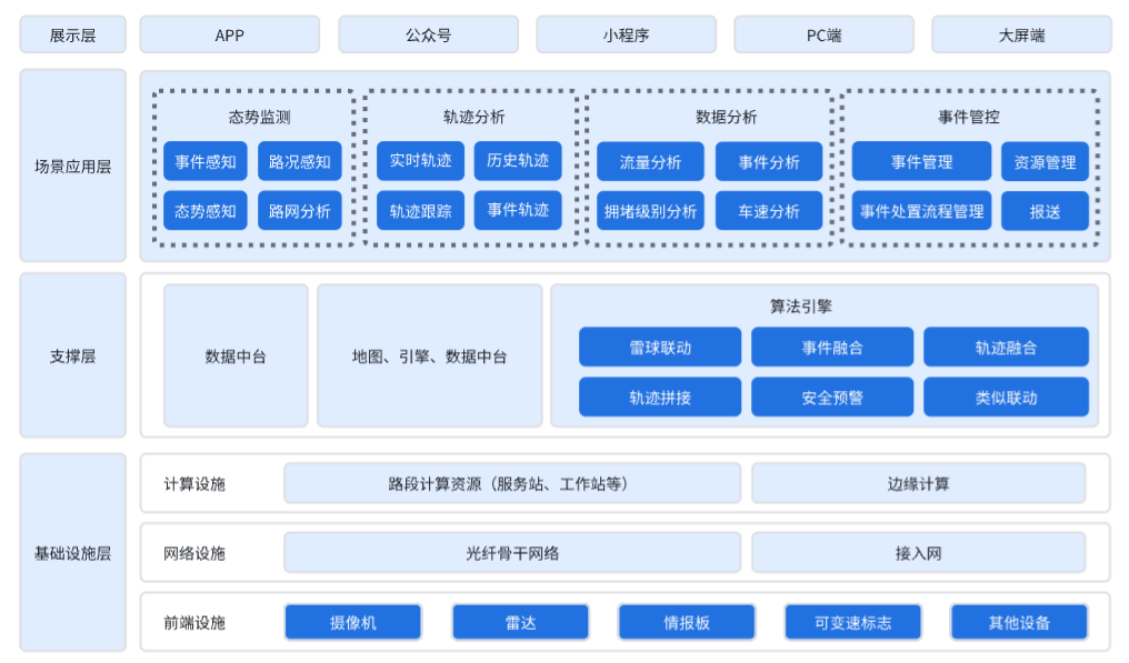 基础设施层:主要是指基础设备的建设,为上层应用展示提供数据支撑,包含计算设施、网络设施和前端设施。其中计算设施包括路段计算资源(服务器、工作站等)和边缘计算的相关设备。网络设施包括光纤网络、接入网的基础设备。前端设施包括摄像枪、雷达、情报板等。