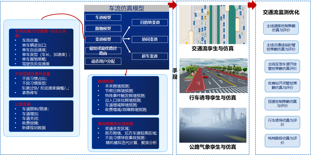高速交通流监测包括主线速度控制策略仿真与评价、主线交通线临时管控策略仿真与评价、主线应急车道开放管控策略仿真评价、收费站开闭管控策略仿真与评价、匝道控制策略仿真与评价、行车诱导仿真与评价、特殊路段仿真与评价等对高速交通流进行全方位监控感知,并基于交通情况生成优化策略,最大化挖掘道路通行能力,实现路网供需均衡匹配,规避拥堵聚集,保障高速路网车流快速通行。