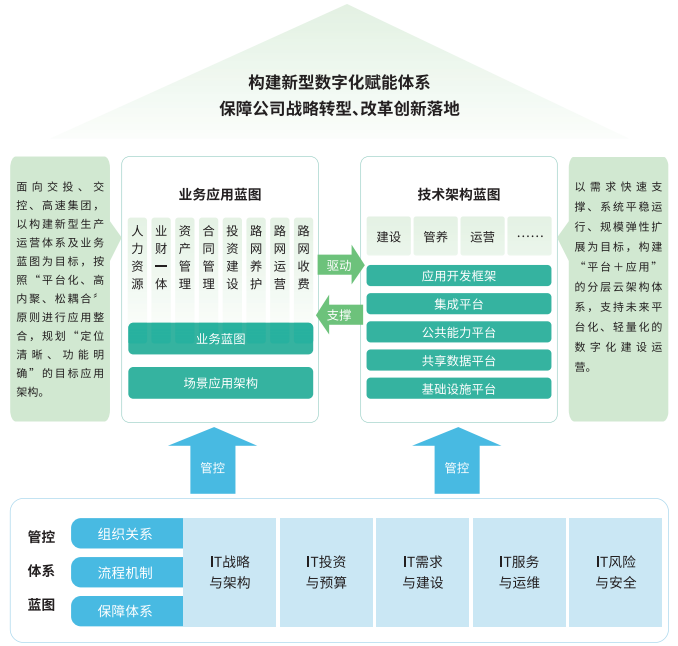 数字化转型解决方案主要是利用数字技术驱动组织运营模式或商业模式的变革,以“顶层设计+业务数据双核驱动”为实施方式,依托交通数字化技术,在规划、建设、运营、经营等四个方面实现全流程、全场景、全要素的数字化洞察,同时探索和验证创新经营模式。业务上,该方案打通、链接分散在不同部门、不同领域的数据信息,实现“人-车-路-流-行”的全息感知、实时研判和全局决策能力,全面地、细粒度地掌握交通出行需求、供给及运行规律;运营上,该方案帮助交通企业实现数字化运营管理,满足集团企业对战略、财务、人力、经营、核心业务价值的管控需求,规范企业标准化业务流程,以数智化手段帮助企业实现精细化管理和智能化运营,支撑集团、子集团和公司间的战略和业务协同,助力交通企业降本增效。