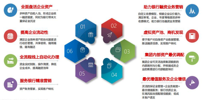 存款资金、票据(银票、商票)、国内外信用证、应收账款、大额存单、债券、理财等流动性资产随时“入池”质押,并生成对应的池融资额度(企业维度的资产池项下会有票据池、 信用证池、存单池、理财池、保证金池等),形成企业统一的融资额度,全面盘活企业资产, 同时为银行带来大量保证金沉淀。