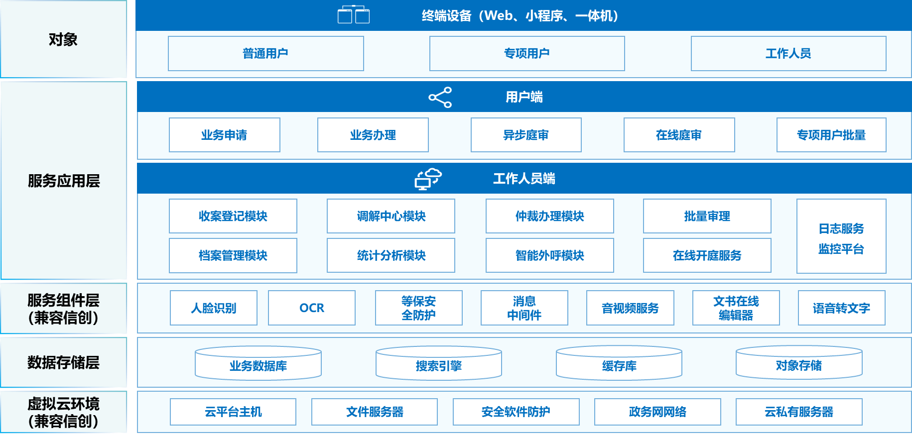 平台构建半开放式设计,实现平台与委办其他工作平台的衔接,实现线上与线下联动的仲裁一站式服务,构建资源共享的一体化平台,提高工作效率。同时,系统整体可靠性高、伸缩性好、扩展性强、配置灵活,推动网上仲裁服务智能化发展。