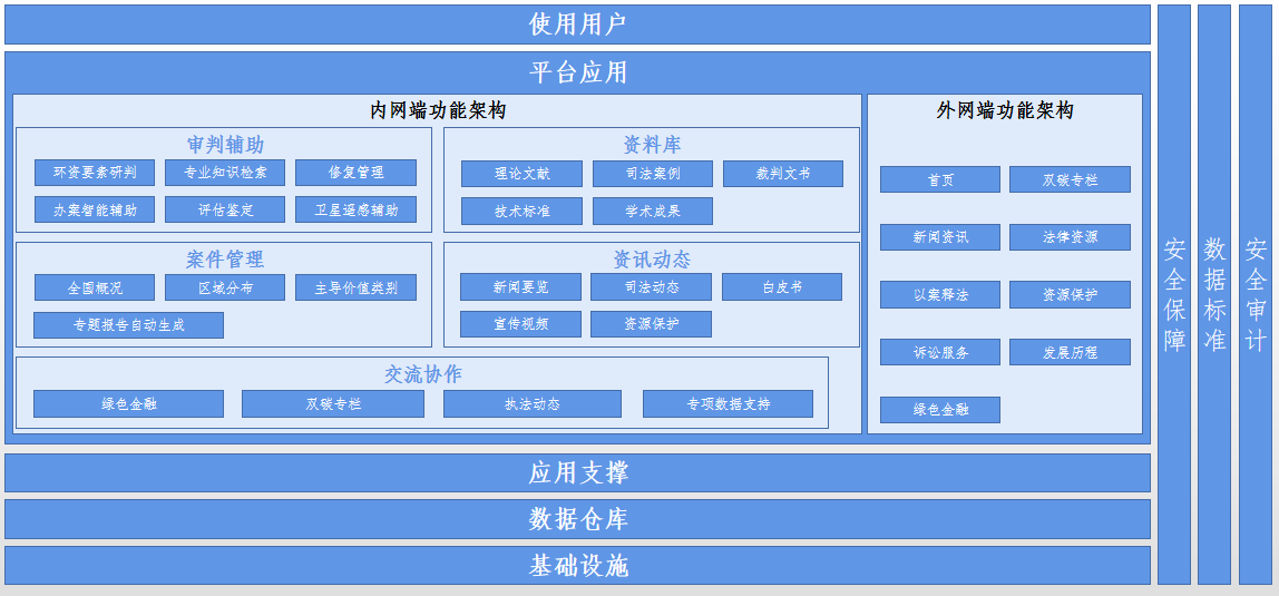 中国环境资源审判信息平台主要由服务审判办案的内网平台和服务人民群众的互联网平台构成。内网端平台重点围绕环资案件立案识别难、专业支持难、闭环管理难、精准统计难、协同审理难等问题建设了审判辅助、案件管理、交流协作、资讯动态、资料库五大模块,为法官审理环资案件提供智能辅助支撑服务。互联网端按照“便民、利民”的建站思路,建设首页、新闻资讯、以案释法、诉讼服务、绿色金融、双碳专栏、法律资源、资源保护、发展历程等九大模块,强化环资审判公众参与度,扩展司法保护辐射范围。