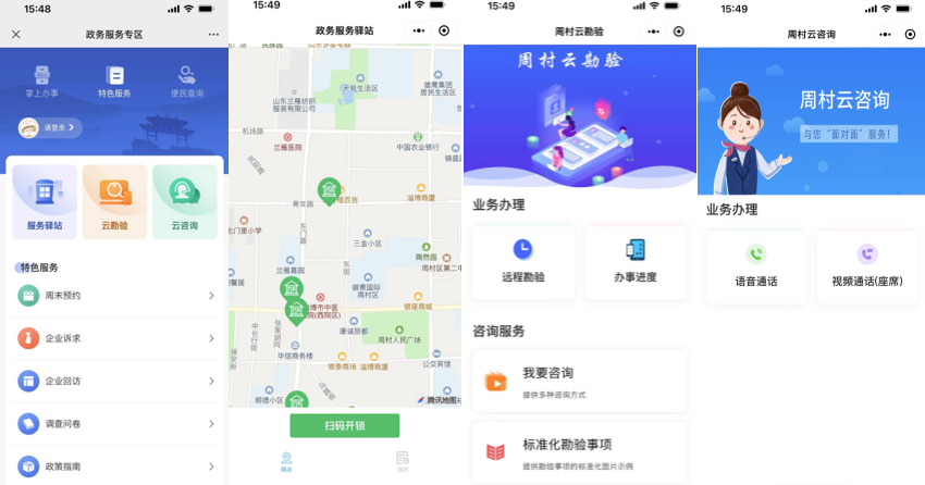 淄博市周村区响应发展数字经济的国家战略,积极推进政务服务事项集成化办理,旨在实现更多事项的异地办、一网通办。针对传统政务咨询多以电话咨询为主,咨询量多,人工客服压力大,缺少快速学习和解答途径;勘验业务跑腿多、耗时长、效率低、成本高;自助机办理业务,遇到问题求助不便等问题,委托北明软件有针对性开发了云咨询系统、云勘验系统和政务服务驿站系统,最大程度便利群众高效办事。